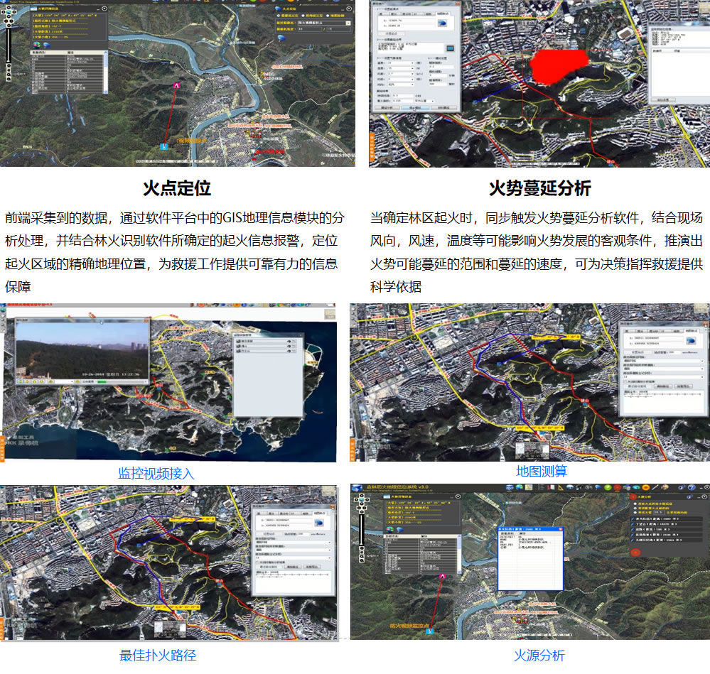 不仅可以获得全面的、清晰的、可录制并回放的多画面现场实时图像,还可以对前端摄像机焦距和云台运动进行操作和控制,对于前端发生林火报警的监控点,通过云台的实时角度回传,结合GIS系统的经纬度数据可以实现火灾发生点的精确定位;