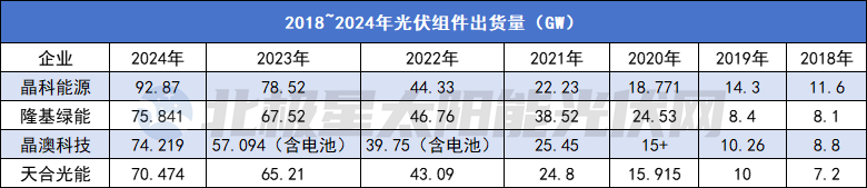 聚焦组件环节,此前北极星根据企业披露数据以及调研情况公布了今年一季度的组件出货量排名情况(2025年Q1光伏组件出货量TOP20),晶科、隆基、晶澳、天合依旧稳居TOP4。2024年度,晶科、隆基、晶澳、天合组件出货量合计超过300GW,占全球光伏新增装机近60%。